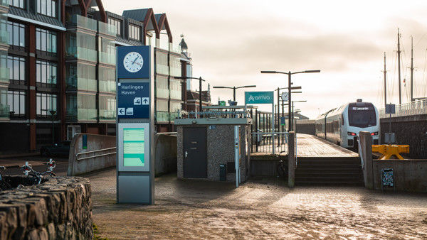 Onderzoek door ProRail toont aan dat reizigers behoefte hebben aan duidelijke herkenningspunten bij een station, heldere informatie over vertrek- en aankomsttijden én faciliteiten op en rondom een station. Aan deze behoefte komt Arriva met het nieuwe centrale informatiepunt op station Harlingen Haven tegemoet. Deze landmark, die een flinke hoogte heeft en bovenin een herkenbare stationsklok, markeert de toegang tot station Harlingen Haven.